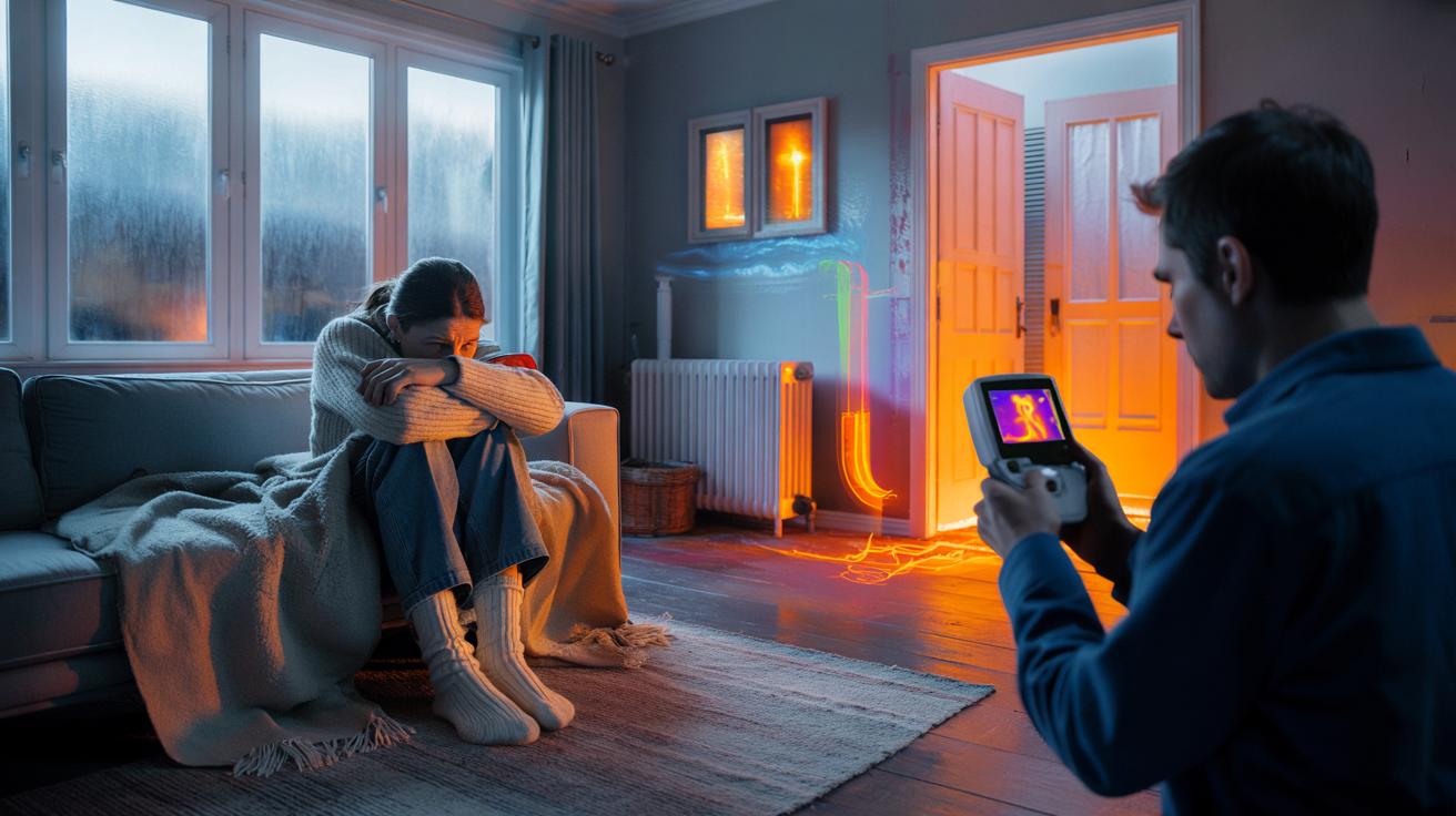 When he finally walked through the house with a thermal camera, the photos told the real story. The walls around the windows burned blue-cold. The floor near the entry door leaked heat like a sieve. The ceiling trapped a hot orange band of air that never came back down to human level. The air was warm. The surfaces were not.